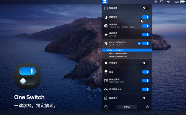 One Switch 完美激活版,带注册机,是一款集合一键切换系统各项功能的工具。它旨在通过快速访问一些重要的交换机来提高用户的工作效率。One Switch Mac版是一款小巧的应用程序,可以从菜单栏打开,只需点击几下即可切换某些系统功能。具体来说,One Switch可以隐藏桌面图标、切换暗模式、保持清醒、切换Dark Mode、保持亮屏、勿扰模式等功能。它还允许用户轻松地在两种模式之间切换或将其设置为全天自动更改。此外,One Switch还可以清理桌面,隐藏和显示桌面图标,甚至可以一键清除桌面垃圾。它还可以方便地立即连接AirPods,无需打开“设置”,只需单击菜单栏中的AirPods,One Switch就会立即连接到设备。此外,One Switch还可以控制Mac,让计算机进入睡眠状态或设置自动进入睡眠状态和从睡眠状态唤醒的时间。