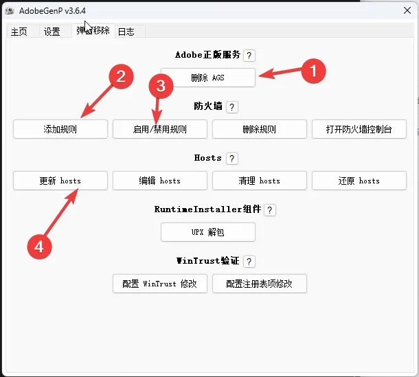运行AdobeGenp.exe按照下面图示进行规则更新,来防止激活失效