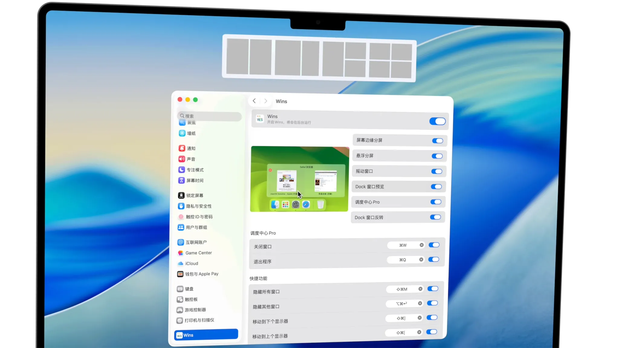 Wins 是一款专为 macOS 设计的智能窗口管理效率工具,通过深度系统集成与人性化交互彻底重构多任务工作流。其核心 动态布局引擎 支持一键分割窗口(如左右分屏、四宫格、浮动模态窗口),并可保存自定义布局组合快速调用;创新的 窗口群组功能 允许将多个应用绑定为任务单元(如“设计套件”:Photoshop+Illustrator+参考网页),同步切换/隐藏/移动。