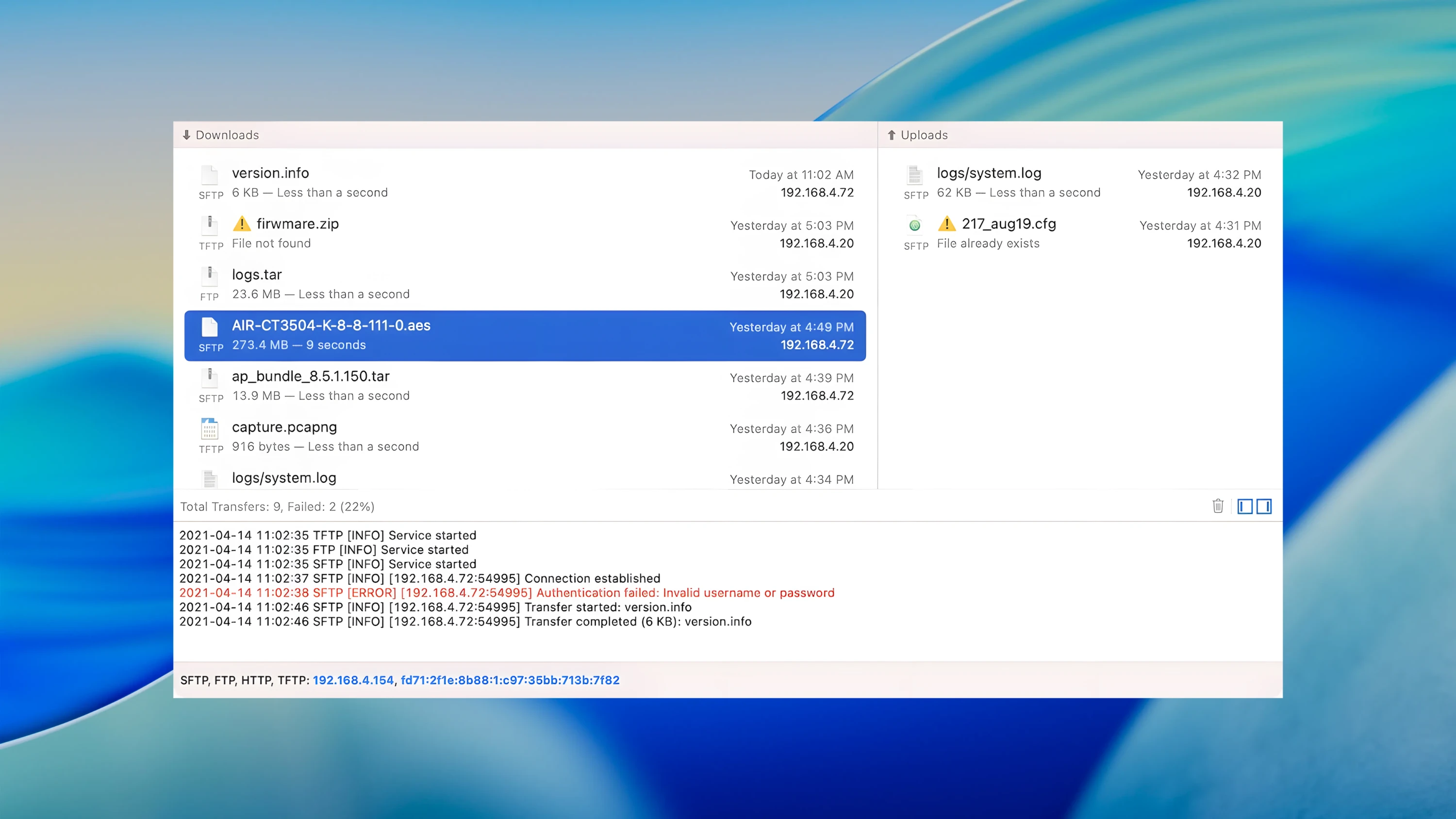Transfer 是专为 macOS 用户打造的高性能 TFTP 服务器解决方案,完全兼容 RFC 标准,可无缝替代系统内置的 TFTP 服务,尤其适合需要稳定、可扩展文件传输环境的工程师与运维人员。它不仅继承了传统 TFTP 的核心能力,更在易用性与功能深度上实现突破:实时传输状态动态更新,让你随时掌握文件上传或下载的进度与状态;内置历史传输日志,所有操作一目了然,便于审计、回溯与故障排查;支持广播请求机制,能高效处理多客户端并发连接,特别适用于校园网、企业局域网或大规模自动化部署场景。软件界面简洁现代,操作逻辑高度直观,无需复杂配置即可上手,同时兼容主流 TFTP 客户端,无论你是使用 Windows、Linux 还是其他 macOS 系统,都能无缝对接。作为一款为专业用户设计的工具,Transfer 不仅满足日常开发与测试需求,更能在高负载网络环境下保持稳定、高效与低延迟,是 TFTP 服务领域兼具实用与前瞻性的选择。它完美适配 macOS Big Sur 及以上版本,用户可通过官方渠道或主流第三方平台直接下载安装,无需担心兼容性或安全性问题。无论是临时搭建测试环境、部署固件更新系统,还是构建自动化部署流水线,Transfer 都能提供可靠、透明、可追溯的传输体验,真正让 TFTP 服务回归“简单、高效、可控”的本质。如果你正在寻找一款比系统自带功能更强大、更智能、更易管理的 TFTP 服务器,Transfer 就是那个值得你信赖的工具,它不只帮你完成传输,更帮你掌控整个过程。